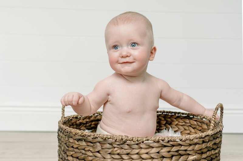Keeping in mind all babies hit milestones at different times, this session typically takes place between 6-8 months. It's a fun times to document as your baby is likely laughing and reacting to you, sitting, maybe even getting into the crawling position. Since they aren't quite mobile we usually get some really precious images- you can consider it the last time they willingly stay still for photos.
